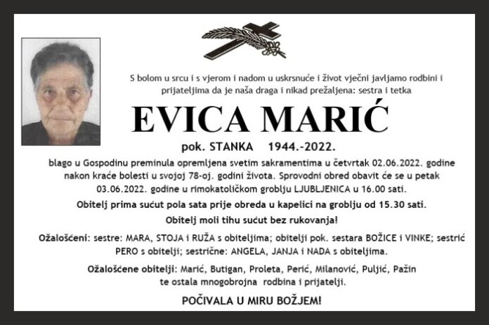 blago u Gospodinu preminula opremljena svetim sakramentima u četvrtak 02.06.2022. godine nakon kraće bolesti u svojoj 78-oj. godini života. Sprovodni obred obavit će se u petak 03.06.2022. godine u rimokatoličkom groblju LJUBLJENICA u 16.00 sati.