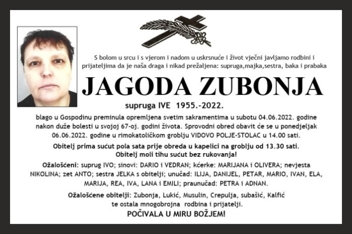 blago u Gospodinu preminula opremljena svetim sakramentima u subotu 04.06.2022. godine nakon duže bolesti u svojoj 67-oj. godini života. Sprovodni obred obavit će se u ponedjeljak 06.06.2022. godine u rimokatoličkom groblju VIDOVO POLJE-STOLAC u 14.00 sati.