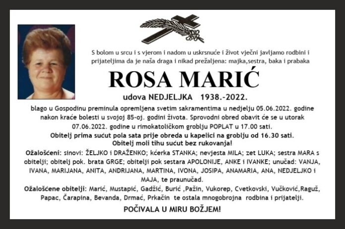 blago u Gospodinu preminula opremljena svetim sakramentima u nedjelju 05.06.2022. godine nakon kraće bolesti u svojoj 85-oj. godini života. Sprovodni obred obavit će se u utorak 07.06.2022. godine u rimokatoličkom groblju POPLAT u 17.00 sati.