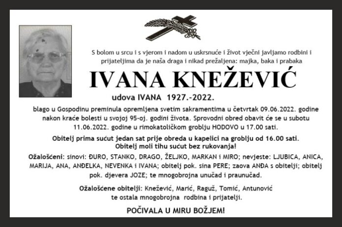 blago u Gospodinu preminula opremljena svetim sakramentima u četvrtak 09.06.2022. godine nakon kraće bolesti u svojoj 95-oj. godini života. Sprovodni obred obavit će se u subotu 11.06.2022. godine u rimokatoličkom groblju HODOVO u 17.00 sati.