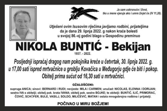 OŽALOŠĆENI: supruga ANICA; sinovi: BERNARD i RUDI; nevjeste: MILA i CARMEN; unučad: NICOLAS, ELENNA i DORIJAN; sestra IVA s obitelji; obitelj pok. brata IVANA; obitelj pok. sestre BOJKE; te obitelji: BUNTIĆ, ILIĆ, PRIMORAC, ČOVIĆ, SCHÖFER, BULE, VASILJ, SOLDO, MILIĆEVIĆ, MATAN i ostala mnogobrojna rodbina i prijatelji.
