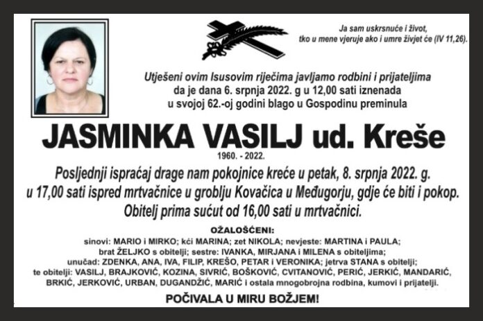 Utješeni ovim Isusovim riječima javljamo rodbini i prijateljima da je dana 6. srpnja 2022. g u 12,00 sati iznenada u svojoj 62.-oj godini blago u Gospodinu preminula
