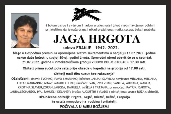 blago u Gospodinu preminula opremljena svetim sakramentima u nedjelju 17.07.2022. godine nakon duže bolesti u svojoj 80-oj. godini života. Sprovodni obred obavit će se u četvrtak 21.07.2022. godine u rimokatoličkom groblju VIDOVO POLJE-STOLAC u 17.30 sati.