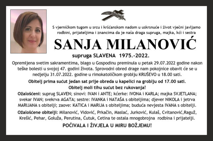 Opremljena svetim sakramentima, blago u Gospodinu preminula u petak 29.07.2022 godine nakon teške bolesti u svojoj 47. godini života. Sprovodni obred drage nam pokojnice obavit će se u nedjelju 31.07.2022. godine u rimokatoličkom groblju KRUŠEVO u 18.00 sati.