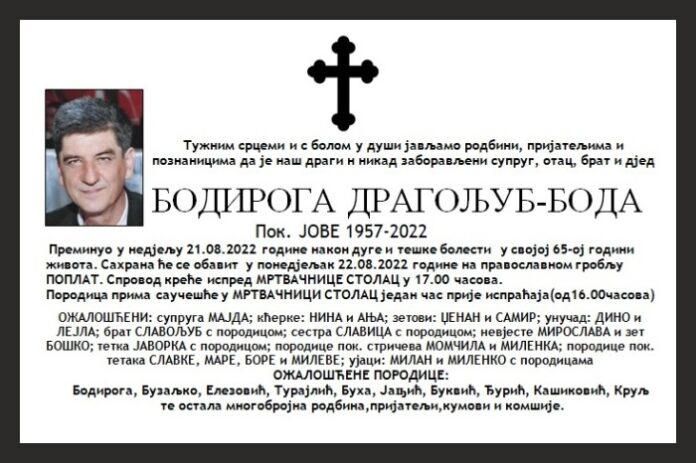 Преминуо у недјељу 21.08.2022 године након дуге и тешке болести у својој 65-ој години живота. Сахрана ће се обавит у понедјељак 22.08.2022 године на православном гробљу ПОПЛАТ. Спровод креће испред МРТВАЧНИЦЕ СТОЛАЦ у 17.00 часова.