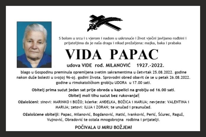 blago u Gospodinu preminula opremljena svetim sakramentima u četvrtak 25.08.2022. godine nakon duže bolesti u svojoj 96-oj. godini života. Sprovodni obred obavit će se u petak 26.08.2022. godine u rimokatoličkom groblju UDORA u 17.00 sati.