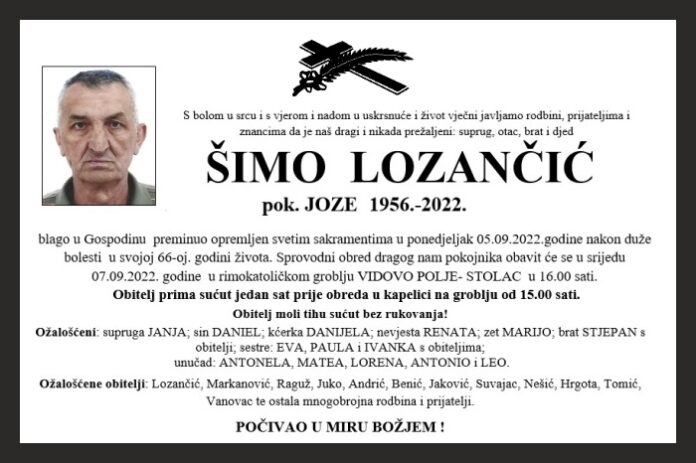 blago u Gospodinu preminuo opremljen svetim sakramentima u ponedjeljak 05.09.2022.godine nakon duže bolesti u svojoj 66-oj. godini života. Sprovodni obred dragog nam pokojnika obavit će se u srijedu 07.09.2022. godine u rimokatoličkom groblju VIDOVO POLJE- STOLAC u 16.00 sati.