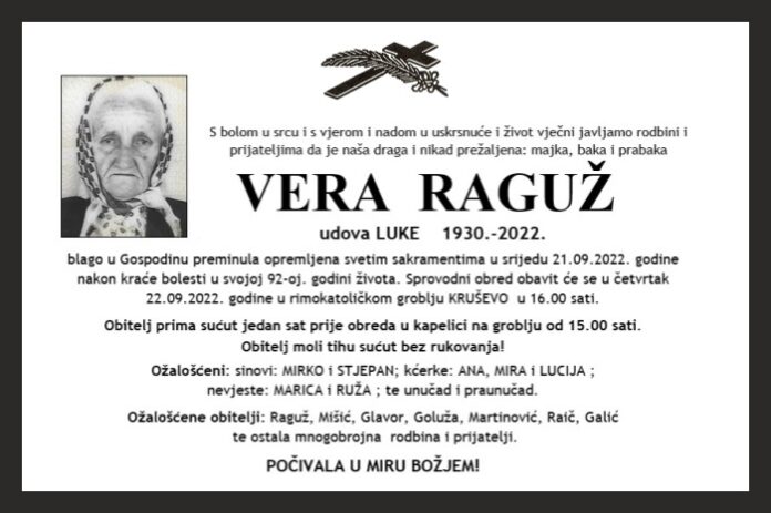 blago u Gospodinu preminula opremljena svetim sakramentima u srijedu 21.09.2022. godine nakon kraće bolesti u svojoj 92-oj. godini života. Sprovodni obred obavit će se u četvrtak 22.09.2022. godine u rimokatoličkom groblju KRUŠEVO u 16.00 sati.