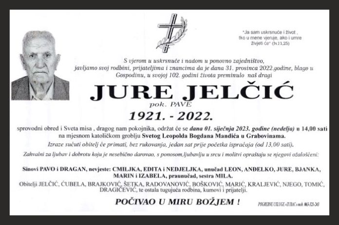 S vjerom u uskrsnuće i nadom u ponovno zajedništvo, javljamo svoj rodbini, prijateljima i znancima da je dana 31. prosinca 2022.godirte, blago u Gospodinu, u svojoj 102. godini života preminulo naš dragi