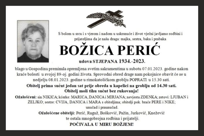 blago u Gospodinu preminula opremljena svetim sakramentima u subotu 07.01.2023. godine nakon kraće bolesti u svojoj 89-oj. godini života. Sprovodni obred drage nam pokojnice obavit će se u nedjelju 08.01.2023. godine u rimokatoličkom groblju POPRATI u 15.30 sati.
