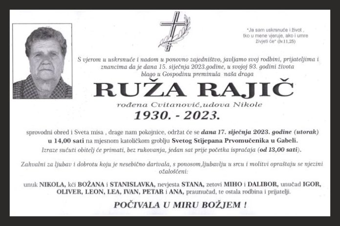 S vjerom u uskrsnuće i nadom u ponovno zajedništvo, javljamo svoj rodbini, prijateljima znancima da je dana 15. siječnja 2023. godine, u svojoj 93. godini života blago u Gospodinu preminula naša draga