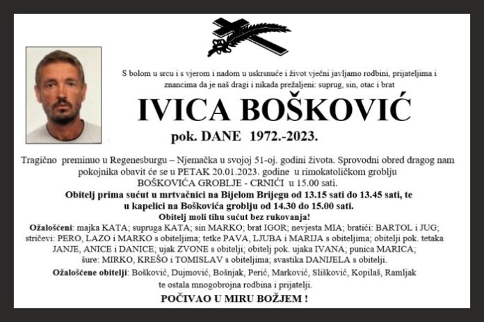 Tragično preminuo u Regenesburgu – Njemačka u svojoj 51-oj. godini života. Sprovodni obred dragog nam pokojnika obavit će se u PETAK 20.01.2023. godine u rimokatoličkom groblju BOŠKOVIĆA GROBLJE – CRNIĆI u 15.00 sati.