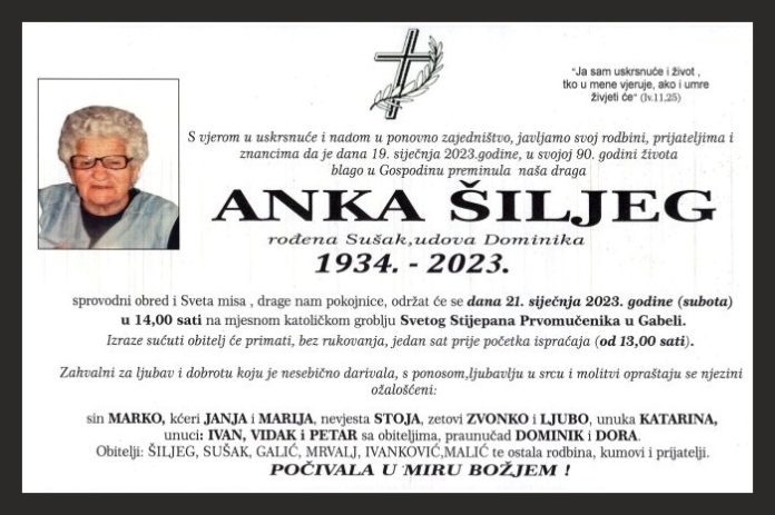 S vjerom u uskrsnuće i nadom u ponovno zajedništvo, javljamo svoj rodbini, prijateljima i znancima da je dana 19. siječnja 2023. godine, u svojoj 90. godini života blago u Gospodinu preminula naša draga