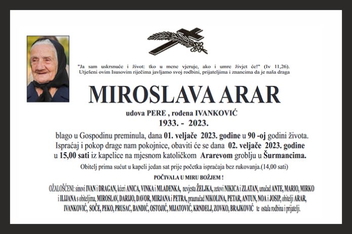 OŽALOŠĆENI: sinovi IVAN i DRAGAN, kćeri ANICA, VINKA i MLADENKA, nevjesta ŽELJKA, zetovi NIKICA i ZLATAN, unučad ANTE, MARIO, MIRKO i ILIJANA s obiteljima, MIROSLAV, DARIJO, DAVOR, MIRJANA i PETRA, praunučad NIKOLINA, PETAR, ANTUN, NOA i JOSIP, obitelji ARAR, IVANKOVIĆ, SOČE, PEKO, PRUSAC, BANDIĆ, OSTOJIĆ, MIJATOVIĆ, KRNDELJ, ZOVKO, BRAJKOVIĆ te ostala rodbina i prijatelji