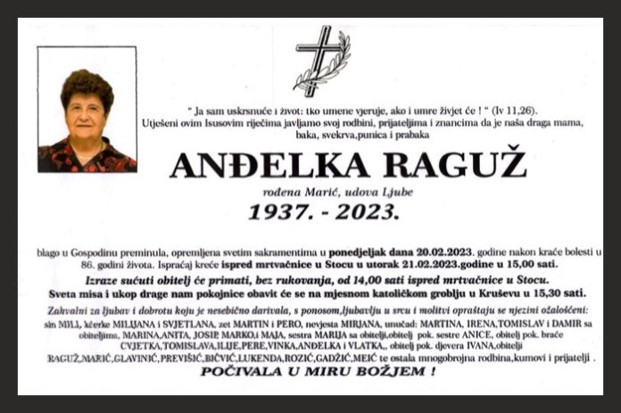 blago u Gospodinu preminula, opremljena svetim sakramentima u ponedjeljak dana 20.02.2023. godine nakon kraće bolesti u 86. godini života. Ispraćaj kreće ispred mrtvačnice u Stocu u utorak 21.02.2023. godine u 15,00 sati.