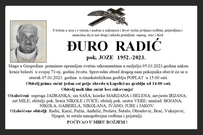 blago u Gospodinu preminuo opremljen svetim sakramentima u nedjelju 05.03.2023.godine nakon kraće bolesti u svojoj 71-oj. godini života. Sprovodni obred dragog nam pokojnika obavit će se u utorak 07.03.2023. godine u rimokatoličkom groblju POPLAT u 15.00 sati.