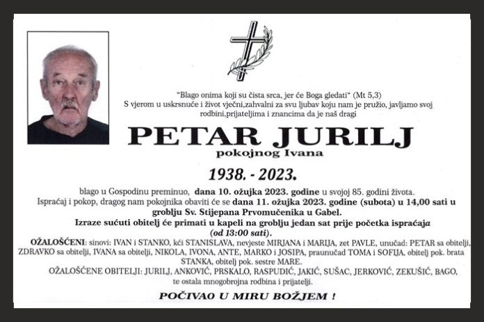 blago u Gospodinu preminuo, dana 10. ožujka 2023. godine u svojoj 85. godini života. Ispraćaj i pokop, dragog nam pokojnika obaviti će se dana 11. ožujka 2023. godine (subota) u 14,00 sati u groblju Sv. Stjepana Prvomučenika u Gabeli.