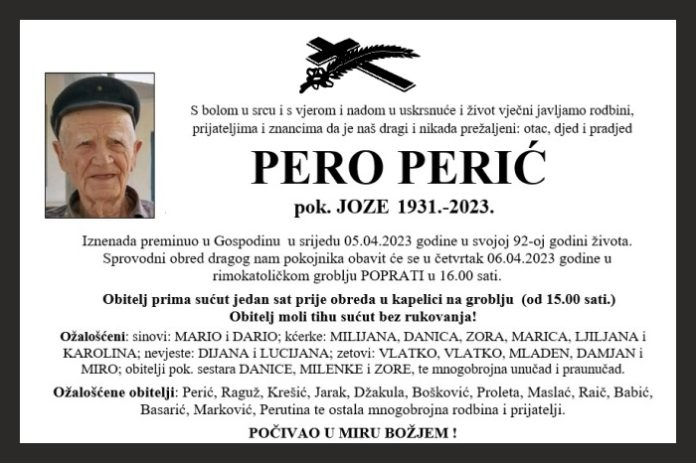 POKOJ VJECNI PERI POCIVAO U MIRU BOZIJEM OBITELJI ISKRENA SUCUT ANDELKA I NIKICA RAIC