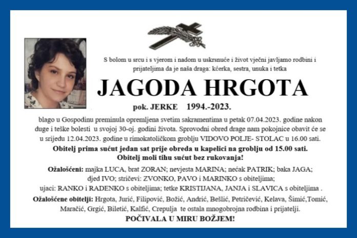 blago u Gospodinu preminula opremljena svetim sakramentima u petak 07.04.2023. godine nakon duge i teške bolesti u svojoj 30-oj. godini života. Sprovodni obred drage nam pokojnice obavit će se u srijedu 12.04.2023. godine u rimokatoličkom groblju VIDOVO POLJE- STOLAC u 16.00 sati.