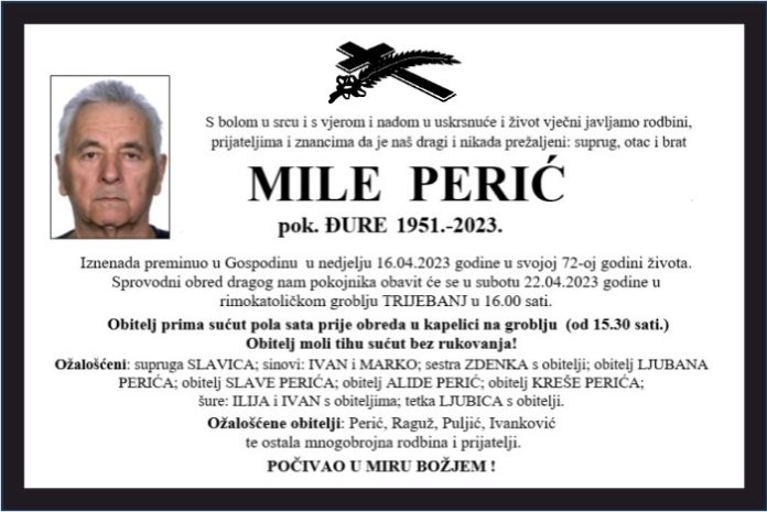 Iznenada preminuo u Gospodinu u nedjelju 16.04.2023 godine u svojoj 72-oj godini života. Sprovodni obred dragog nam pokojnika obavit će se u subotu 22.04.2023 godine u rimokatoličkom groblju TRIJEBANJ u 16.00 sati.