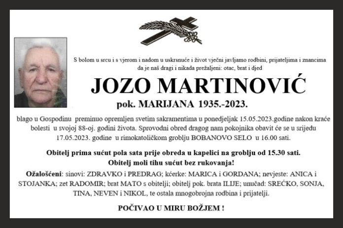 blago u Gospodinu preminuo opremljen svetim sakramentima u ponedjeljak 15.05.2023.godine nakon kraće bolesti u svojoj 88-oj. godini života. Sprovodni obred dragog nam pokojnika obavit će se u srijedu 17.05.2023. godine u rimokatoličkom groblju BOBANOVO SELO u 16.00 sati.