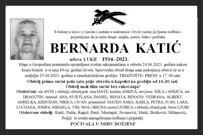blago u Gospodinu preminula opremljena svetim sakramentima u subotu 24.06.2023. godine nakon kraće bolesti u svojoj 89-oj. godini života. Sprovodni obred drage nam pokojnice obavit će se u nedjelju 25.06.2023. godine u rimokatoličkom groblju TRGOVIŠTE- PRENJ u 17. 00 sati.
