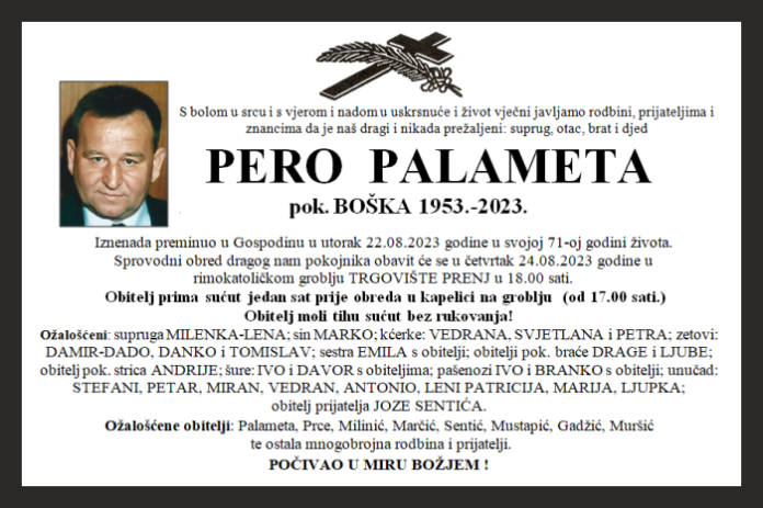 Iznenada preminuo u Gospodinu u utorak 22.08.2023 godine u svojoj 71-oj godini života. Sprovodni obred dragog nam pokojnika obavit će se u četvrtak 24.08.2023 godine u rimokatoličkom groblju TRGOVIŠTE PRENJ u 18.00 sati.
