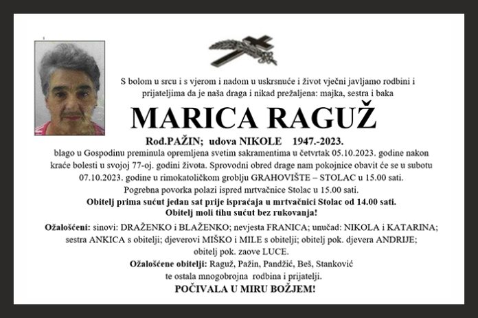 blago u Gospodinu preminula opremljena svetim sakramentima u četvrtak 05.10.2023. godine nakon kraće bolesti u svojoj 77-oj. godini života. Sprovodni obred drage nam pokojnice obavit će se u subotu, 07.10.2023. godine u rimokatoličkom groblju GRAHOVIŠTE – STOLAC u 15.00 sati.