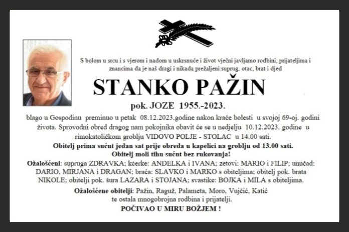 blago u Gospodinu preminuo u petak 08.12.2023. godine nakon kraće bolesti u svojoj 69-oj. godini života. Sprovodni obred dragog nam pokojnika obavit će se u nedjelju 10.12.2023. godine u rimokatoličkom groblju VIDOVO POLJE STOLAC u 14.00 sati.