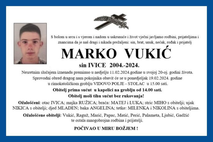 Nesretnim slučajem iznenada preminuo u nedjelju 11.02.2024. godine u svojoj 20-oj. godini života. Sprovodni obred dragog nam pokojnika obavit će se u ponedjeljak 19.02.2024. godine u rimokatoličkom groblju VIDOVO POLJE – STOLAC u 15.00 sati.
