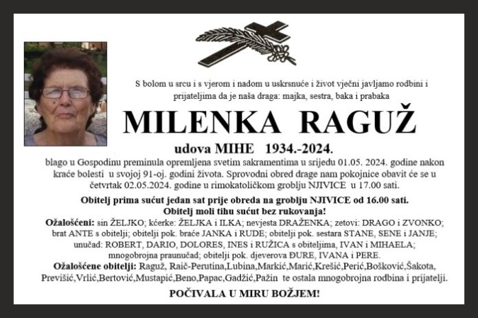blago u Gospodinu preminula opremljena svetim sakramentima u srijedu 01.05. 2024. godine nakon kraće bolesti u svojoj 91-oj. godini života. Sprovodni obred drage nam pokojnice obavit će se u četvrtak 02.05.2024. godine u rimokatoličkom groblju NJIVICE u 17.00 sati.