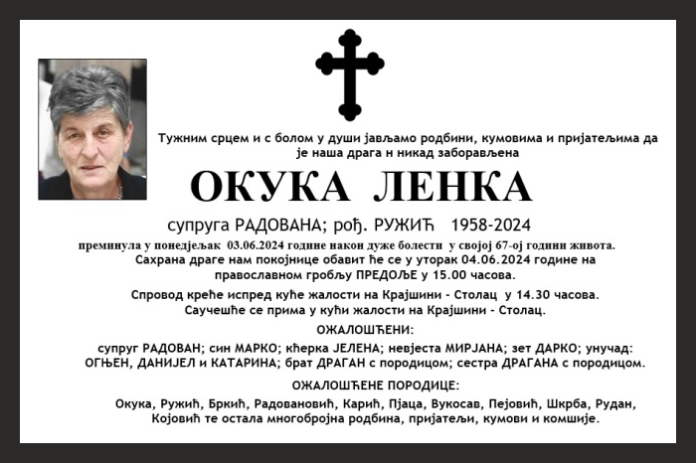 преминула у понедјељак 03.06.2024 године након дуже болести у својој 67-ој години живота. Сахрана драге нам покојнице обавит ће се у уторак 04.06.2024 године на православном гробљу ПРЕДОЉЕ у 15.00 часова.