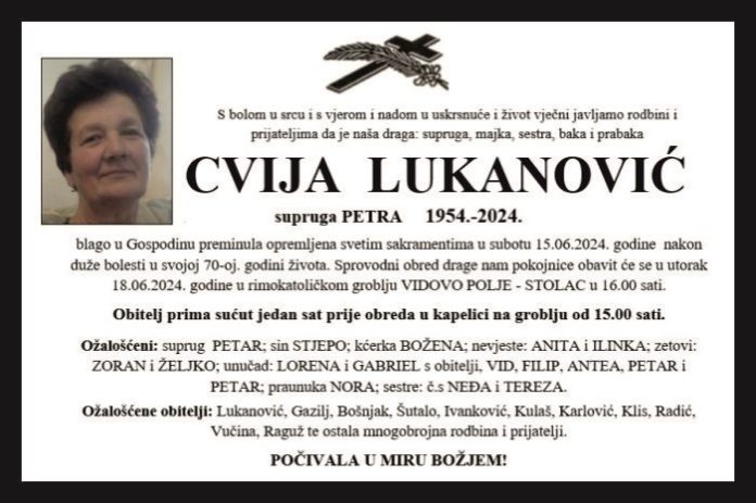 blago u Gospodinu preminula opremljena svetim sakramentima u subotu 15.06.2024. godine nakon duže bolesti u svojoj 70-oj. godini života. Sprovodni obred drage nam pokojnice obavit će se u utorak 18.06.2024. godine u rimokatoličkom groblju VIDOVO POLJE – STOLAC u 16.00 sati.