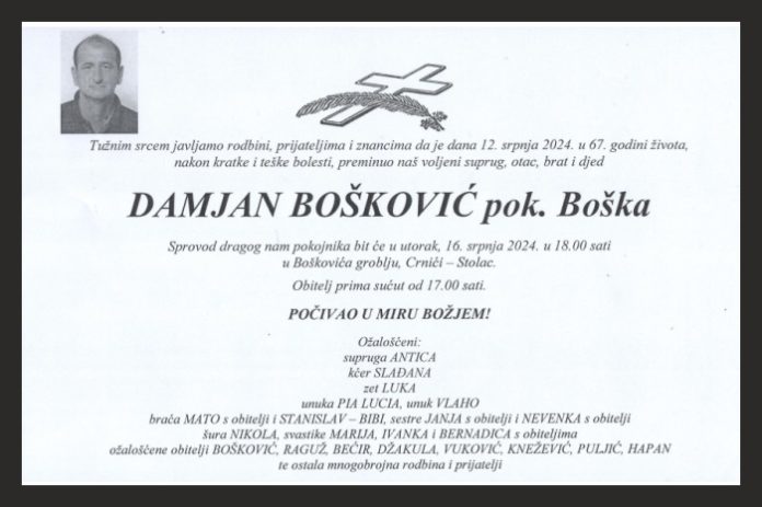 Sprovod dragog nam pokojnika bit će u utorak, 16. srpnja 2024. u 18.00 sati u Boškovića groblju, Crnići — Stolac.