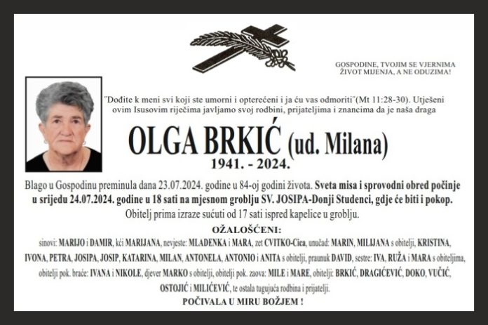 Blago u Gospodinu preminula dana 23.07.2024. godine u 84-oj godini života. Sveta misa i sprovodni obred počinje u srijedu 24.07.2024. godine u 18 sati na mjesnom groblju SV. JOSIPA – Donji Studenci, gdje će biti i pokop.