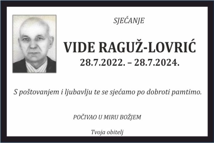 -Sjećanje- Vide Raguž – Lovrić 28 srpnja, 2024 0 SJEĆANJE VIDE RAGUŽ-LOVRIĆ 28.7.2022. – 28.7.2024. S poštovanjem i ljubavlju te se sjećamo po dobroti pamtimo. POČIVAO U MIRU BOŽJEM Tvoja obitelj
