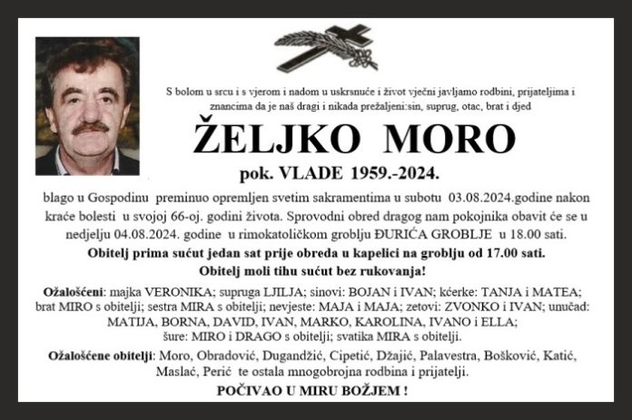 blago u Gospodinu preminuo opremljen svetim sakramentima u subotu 03.08.2024.godine nakon kraće bolesti u svojoj 66-oj. godini života. Sprovodni obred dragog nam pokojnika obavit će se u nedjelju 04.08.2024. godine u rimokatoličkom groblju ĐURIĆA GROBLJE u 18.00 sati.