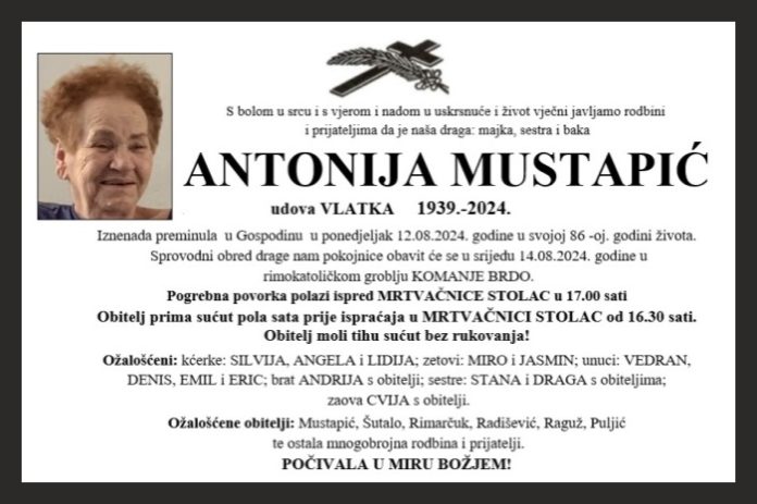 Iznenada preminula u Gospodinu u ponedjeljak 12.08.2024. godine u svojoj 86 -oj. godini života. Sprovodni obred drage nam pokojnice obavit će se u srijedu 14.08.2024. godine u rimokatoličkom groblju KOMANJE BRDO. Pogrebna povorka polazi ispred MRTVAČNICE STOLAC u 17.00 sati