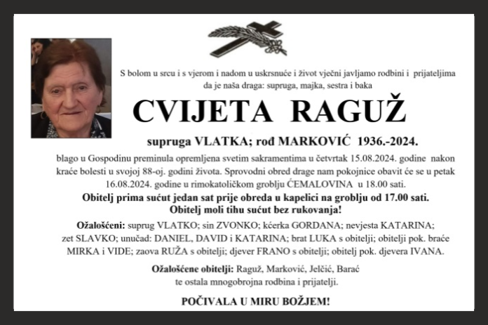 blago u Gospodinu preminula opremljena svetim sakramentima u četvrtak 15.08.2024. godine nakon kraće bolesti u svojoj 88-oj. godini života. Sprovodni obred drage nam pokojnice obavit će se u petak 16.08.2024. godine u rimokatoličkom groblju ĆEMALOVINA u 18.00 sati.