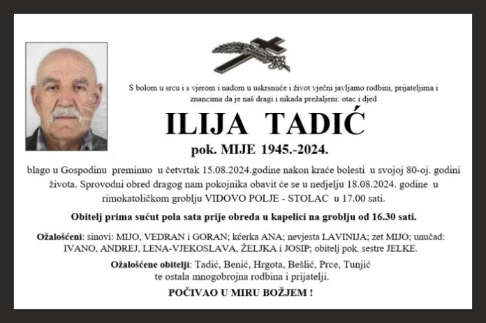 blago u Gospodinu preminuo u četvrtak 15.08.2024.godine nakon kraće bolesti u svojoj 80-oj. godini života. Sprovodni obred dragog nam pokojnika obavit će se u nedjelju 18.08.2024. godine u rimokatoličkom groblju VIDOVO POLJE – STOLAC u 17.00 sati.