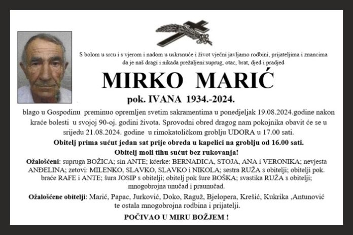 blago u Gospodinu preminuo opremljen svetim sakramentima u ponedjeljak 19.08.2024.godine nakon kraće bolesti u svojoj 90-oj. godini života. Sprovodni obred dragog nam pokojnika obavit će se u srijedu 21.08.2024. godine u rimokatoličkom groblju UDORA u 17.00 sati.