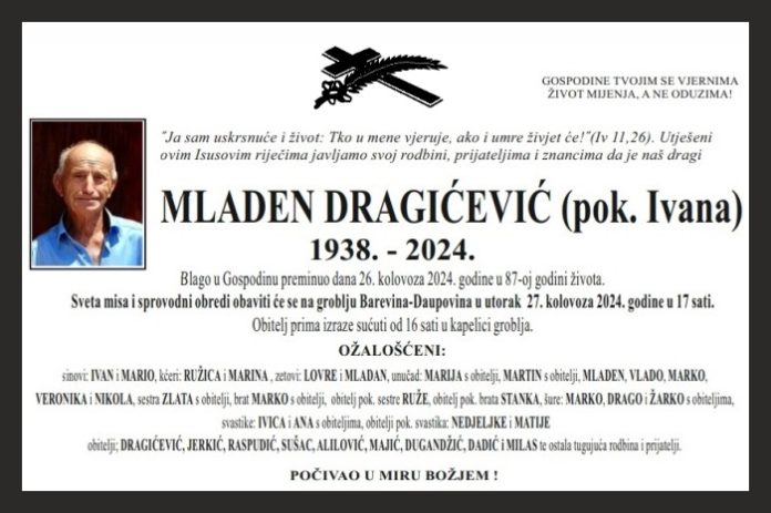 Blago u Gospodinu preminuo dana 26. kolovoza 2024. godine u 87-oj godini života. Sveta misa i sprovodni obredi obaviti će se na groblju Barevina-Daupovina u utorak 27. kolovoza 2024. godine u 17 sati.