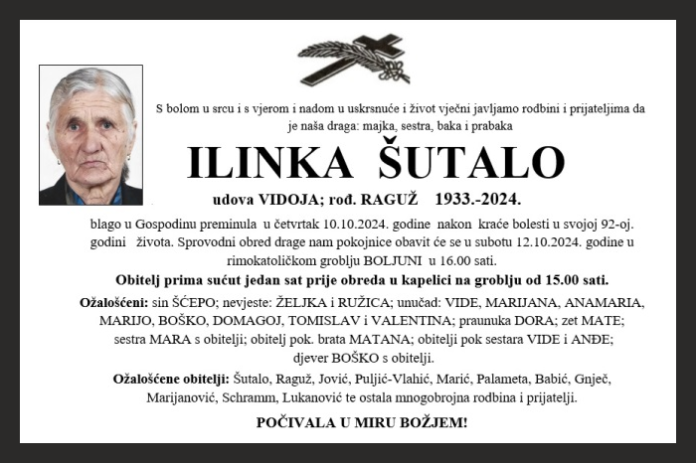 blago u Gospodinu preminula u četvrtak 10.10.2024. godine nakon kraće bolesti u svojoj 92-oj. godini života. Sprovodni obred drage nam pokojnice obavit će se u subotu 12.10.2024. godine u rimokatoličkom groblju BOLJUNI u 16.00 sati.