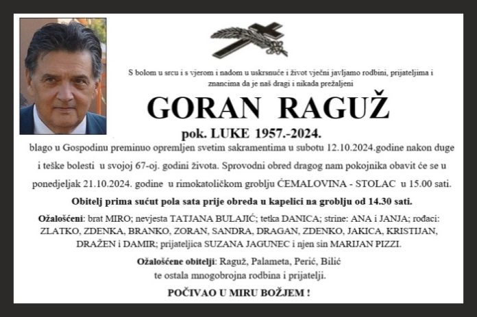 blago u Gospodinu preminuo opremljen svetim sakramentima u subotu 12.10.2024.godine nakon duge i teške bolesti u svojoj 67-oj. godini života. Sprovodni obred dragog nam pokojnika obavit će se u ponedjeljak 21.10.2024. godine u rimokatoličkom groblju ĆEMALOVINA – STOLAC u 15.00 sati.