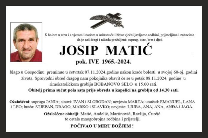 blago u Gospodinu preminuo u četvrtak 07.11.2024.godine nakon kraće bolesti u svojoj 60-oj. godini života. Sprovodni obred dragog nam pokojnika obavit će se u petak 08.11.2024. godine u rimokatoličkom groblju BOBANOVO SELO u 15.00 sati.