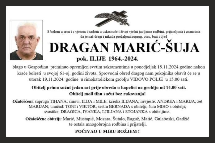 blago u Gospodinu preminuo opremljen svetim sakramentima u ponedjeljak 18.11.2024.godine nakon kraće bolesti u svojoj 61-oj. godini života. Sprovodni obred dragog nam pokojnika obavit će se u utorak 19.11.2024. godine u rimokatoličkom groblju VIDOVO POLJE u 15.00 sati.