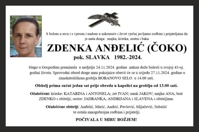 blago u Gospodinu preminula u nedjelju 24.11.2024. godine nakon duže bolesti u svojoj 43-oj. godini života. Sprovodni obred drage nam pokojnice obavit će se u srijedu 27.11.2024. godine u rimokatoličkom groblju BOBANOVO SELO u 14.00 sati.