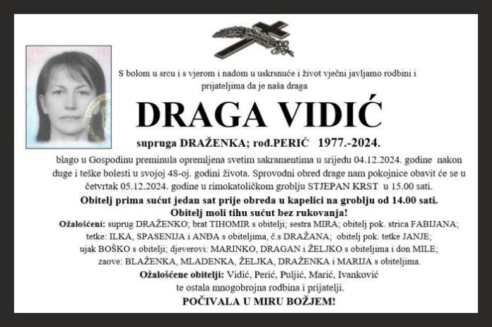 blago u Gospodinu preminula opremljena svetim sakramentima u srijedu 04.12.2024. godine nakon duge i teške bolesti u svojoj 48-oj. godini života. Sprovodni obred drage nam pokojnice obavit će se u četvrtak 05.12.2024. godine u rimokatoličkom groblju STJEPAN KRST u 15.00 sati.