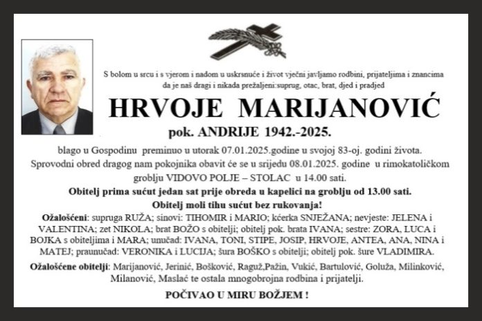 blago u Gospodinu preminuo u utorak 07.01.2025.godine u svojoj 83-oj. godini života. Sprovodni obred dragog nam pokojnika obavit će se u srijedu 08.01.2025. godine u rimokatoličkom groblju VIDOVO POLJE – STOLAC u 14.00 sati.