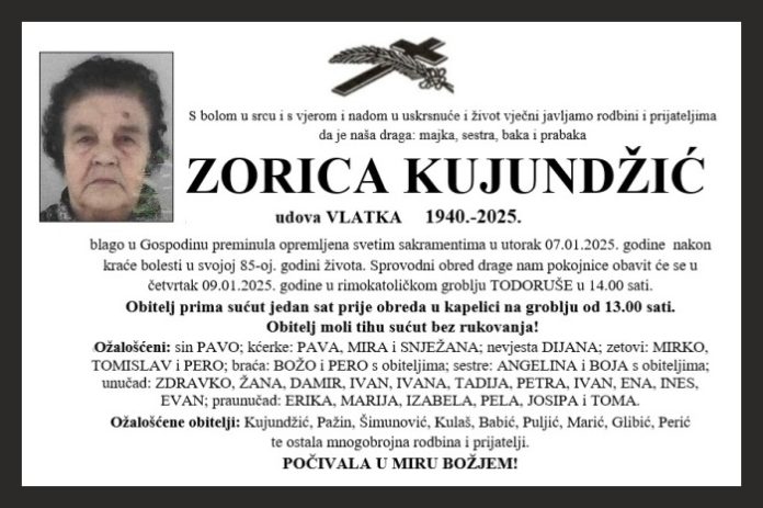 blago u Gospodinu preminula opremljena svetim sakramentima u utorak 07.01.2025. godine nakon kraće bolesti u svojoj 85-oj. godini života. Sprovodni obred drage nam pokojnice obavit će se u četvrtak 09.01.2025. godine u rimokatoličkom groblju TODORUŠE u 14.00 sati.
